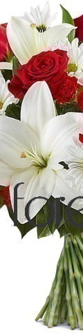 8 x Red Roses, 4 x White Lilies, 8 x Red Spray Carnations, White Chrysanthemums